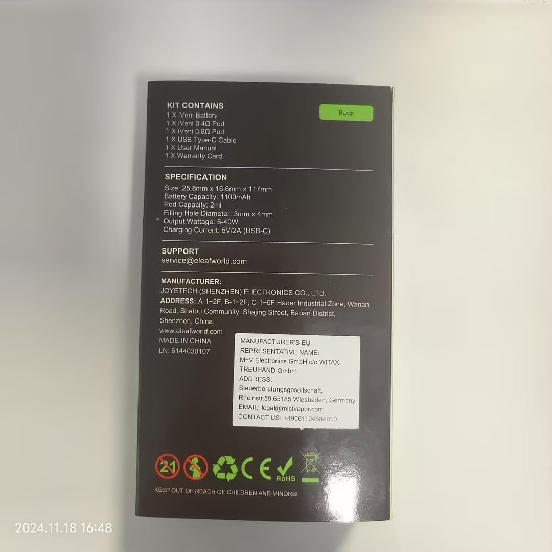 The kit includes 0.4 ohm and 0.8 ohm iVeni pods, designed specifically for this model to ensure optimal performance and vapor quality.