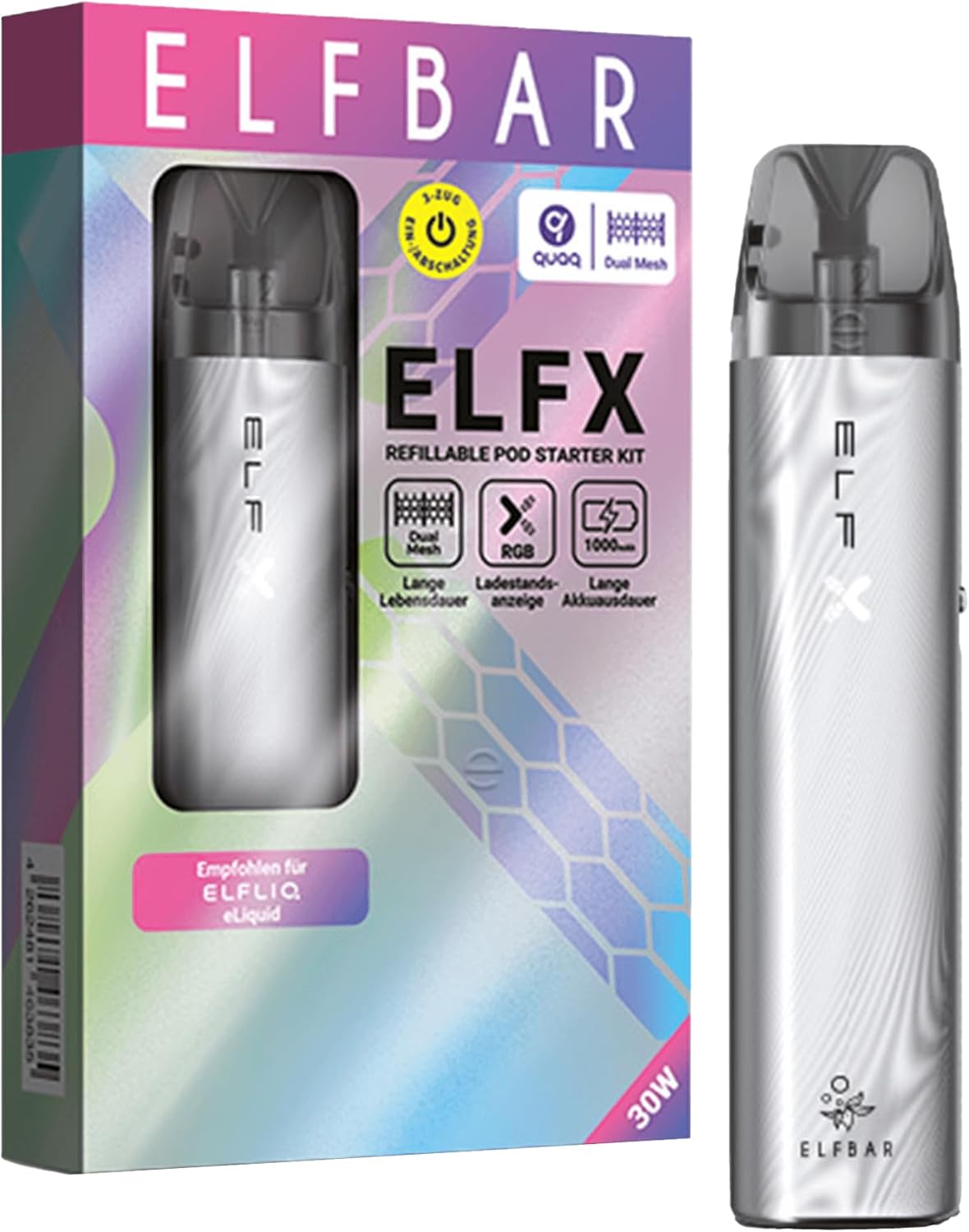 Measuring 10 x 2 x 0.5 cm and weighing only 100 grams, the ELF Bar ELFX features a durable aluminum alloy and PCTG construction. With a maximum power output of 30W and 1000mAh battery capacity, it supports USB-C charging at 5V with 1A maximum charging current. The device includes RGB lighting indicators and comprehensive protection features including child safety locks.