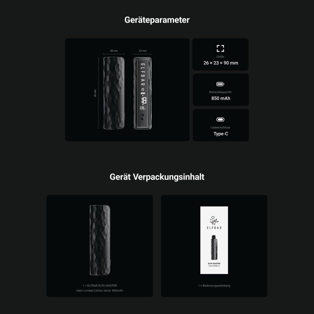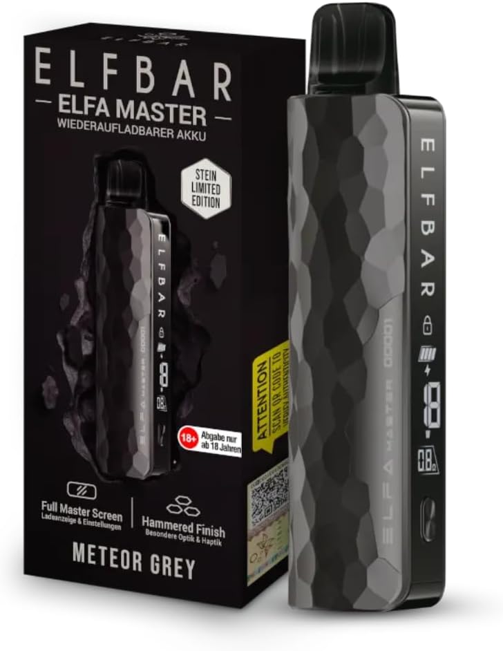 The ELFBAR ELFA MASTER Limited Edition is a premium electric cigarette designed for reliability and ease of use. It includes an 850mAh battery with USB-C fast charging, an intuitive color display for monitoring battery and settings, and variable power adjustment. The device supports both MTL and RDL vaping styles and features a magnetic pod connection for secure and effortless pod changes.