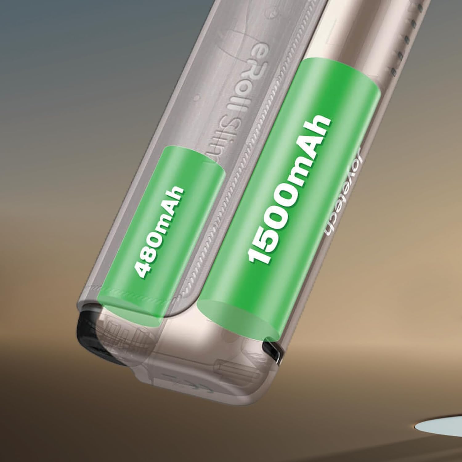 Measuring 10.7 x 2.3 x 4.4 cm and weighing only 102.5 grams, the Eroll Slim offers a compact yet substantial feel. The device model JTOYE369K03-DE comes with a powerful 1500mAh PCC battery capacity complemented by an additional 480mAh device battery. It supports 2ml refillable pods and includes two different 510 mouthpieces to accommodate various vaping preferences and styles.