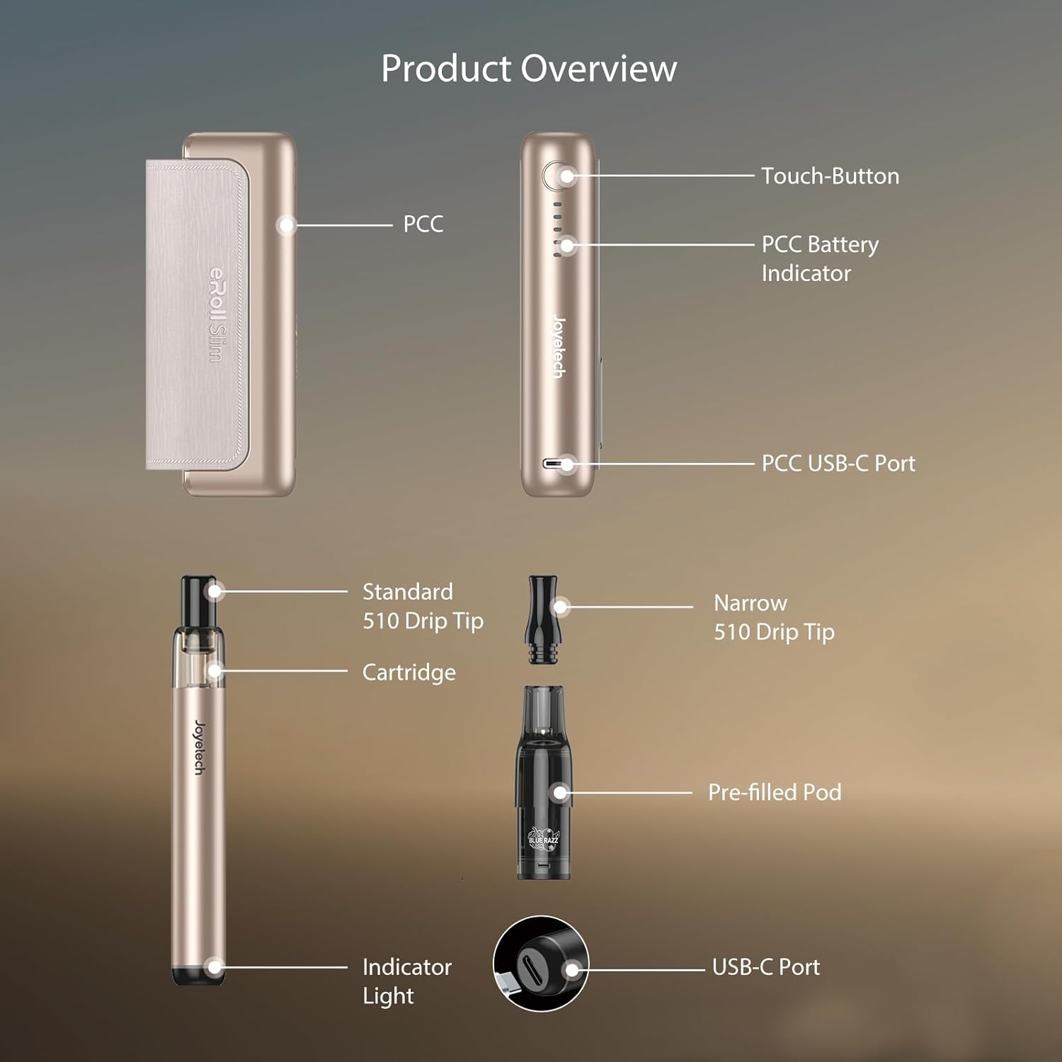 The kit includes the main device, PCC charging case, refillable pods, and two different 510 mouthpieces to suit various vaping preferences.