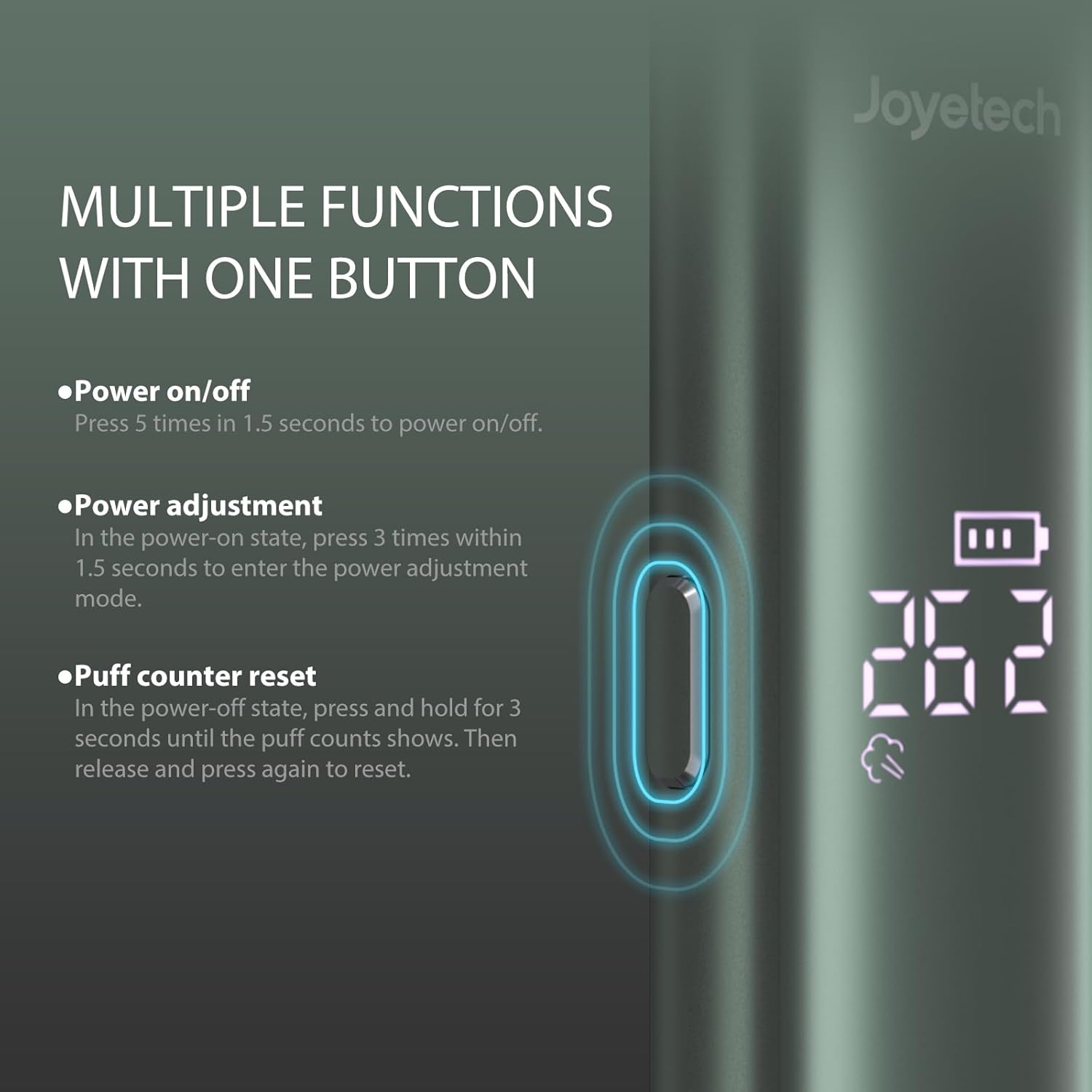 Power adjustment is simple with the Evio M Pro. While the device is turned on, quickly press the fire button three times within 1.5 seconds to enter the power adjustment mode. The all-in-one screen will display the current power level for easy monitoring during adjustment.
