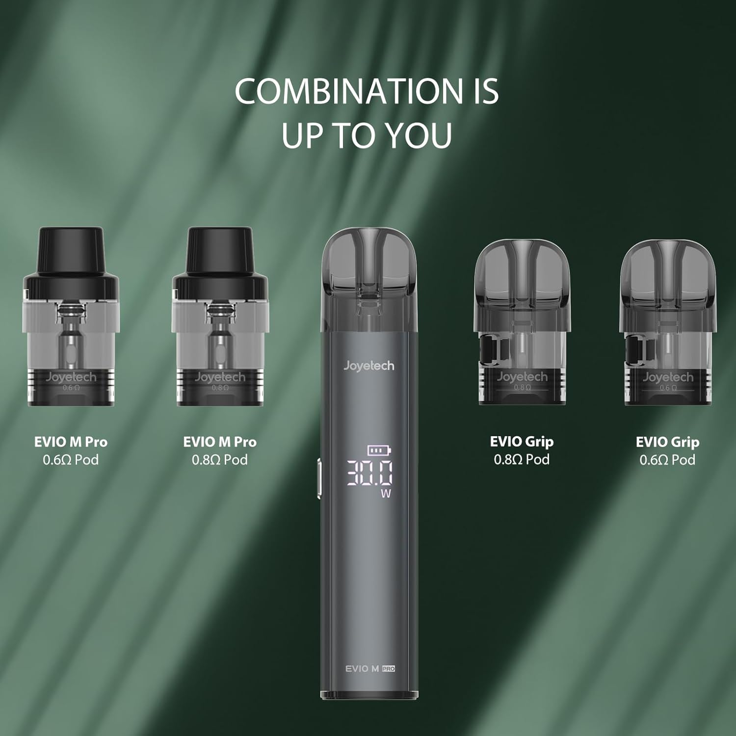 The Evio M Pro is designed to work with both Evio M pods and Evio Giro cartridges, giving users flexibility in choosing their preferred pod style. Both cartridge types are available in various resistance options to match different vaping preferences.