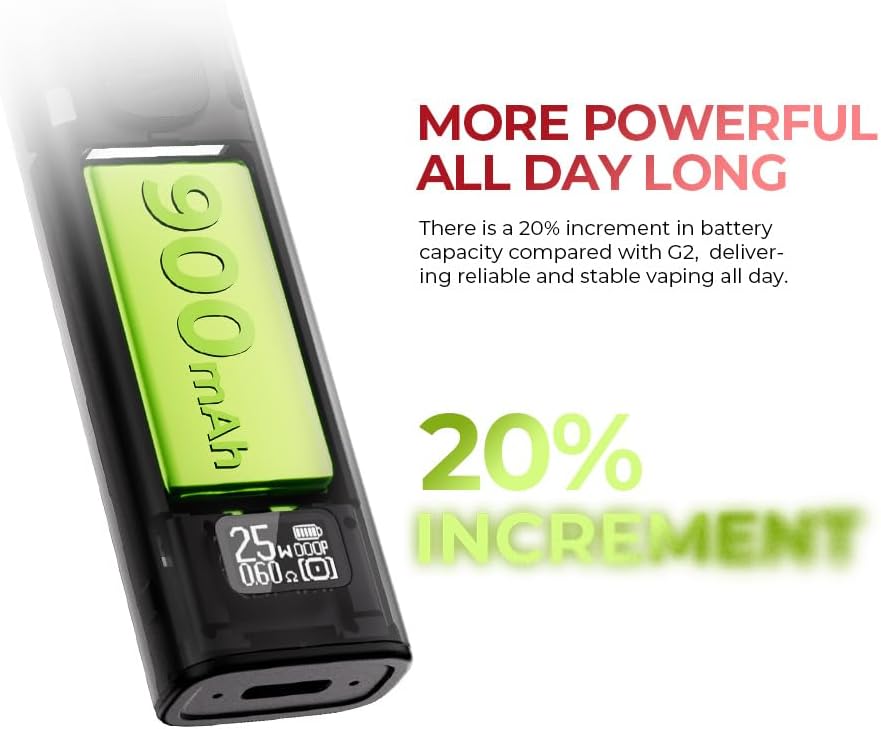 The 900mAh battery provides several hours of use depending on frequency, typically lasting a full day with moderate vaping.
