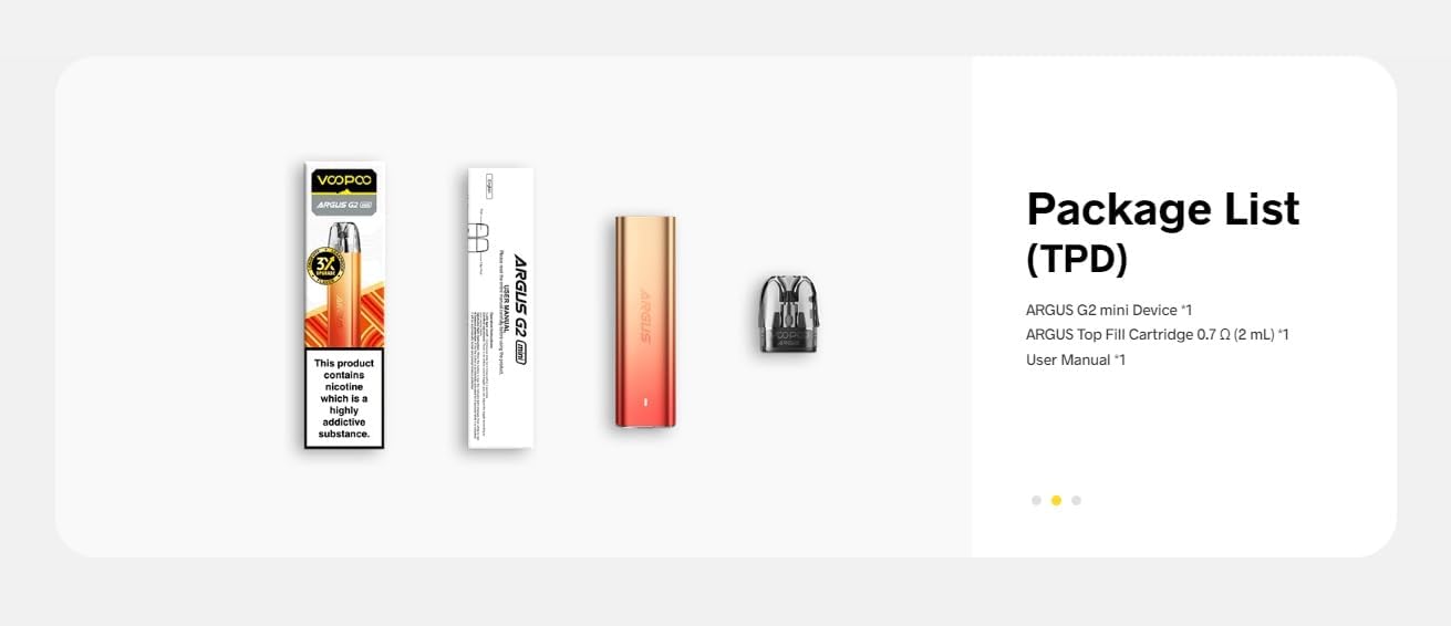 The Argus G2 Mini is compatible with all Voopoo Argus series pods and coils, allowing for flexibility in coil resistance and e-liquid types.