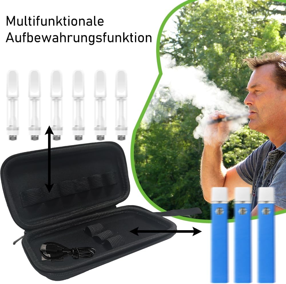 - Versatile storage for 3 e-cigarette pens, 6 vape tips, cables, and batteries